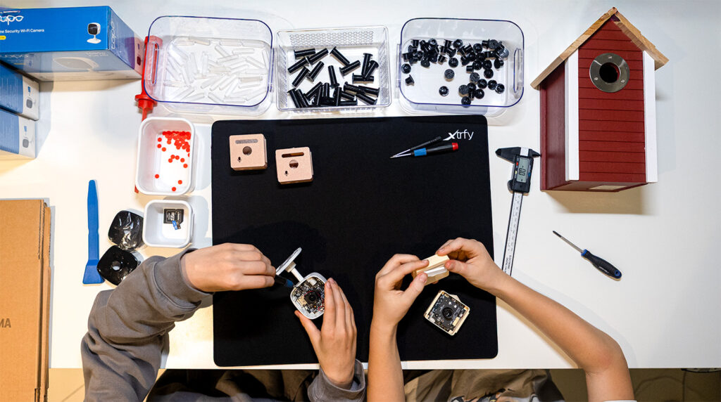 Vårt C100 kamera er et overvåkningskamera fra TP-link som vi har modifisert ved å flytte elektronikken over til eget 3D printet hus, fjernet alarm og lys som forstyrrer fuglelivet og kalibrert linsen til å gi skarpe bilder i små fuglekasser.